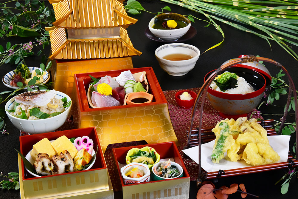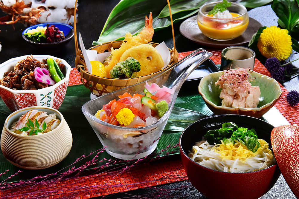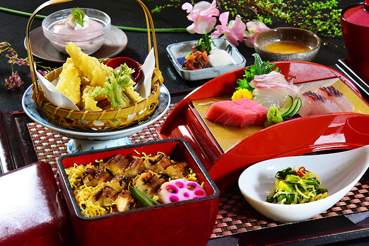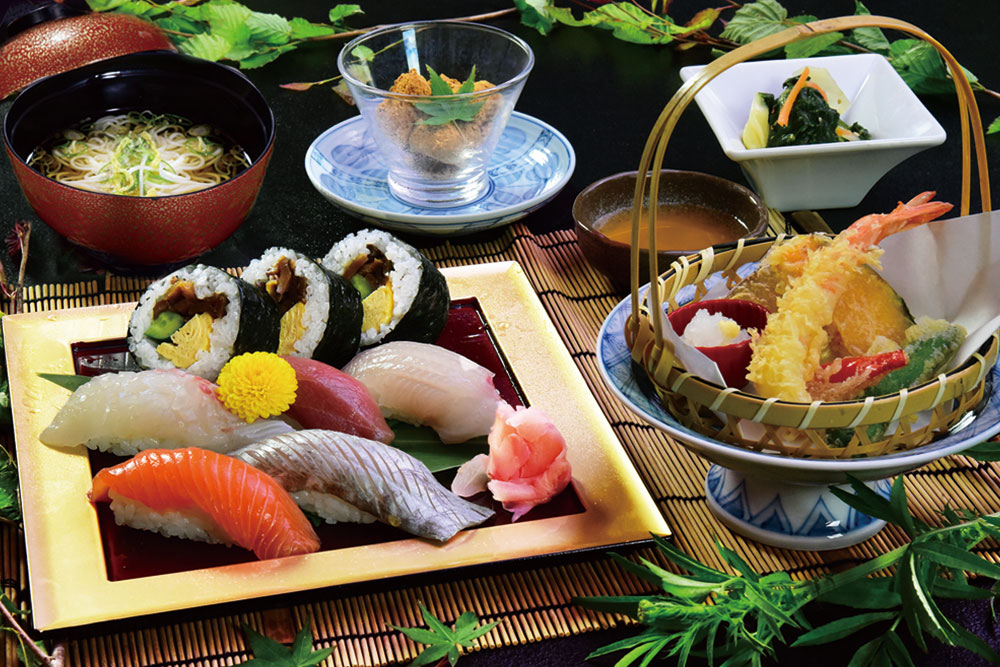 播磨灘の彩り寿司は瀬戸内産の海鮮「穴子」「鯖」「足赤海老」と 地元・夢前町の玉子を使用。料理長がひとつひとつ丁寧に仕上 げ、将棋盤を思わせるようなモザイク状に並べた押し寿司は、 見た目も華やか。また磯香るあおさのりをのせた「播州手延べそうめん揖保乃糸」のにゅう麺は瀬戸内産の鯛との相性抜群 です。- ・穴子、鯖、足赤海老のモザイク押し寿司